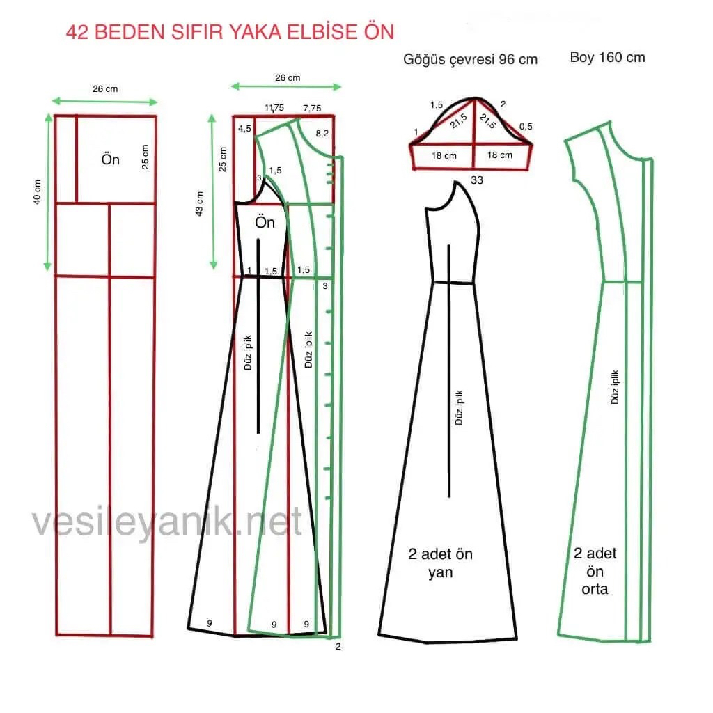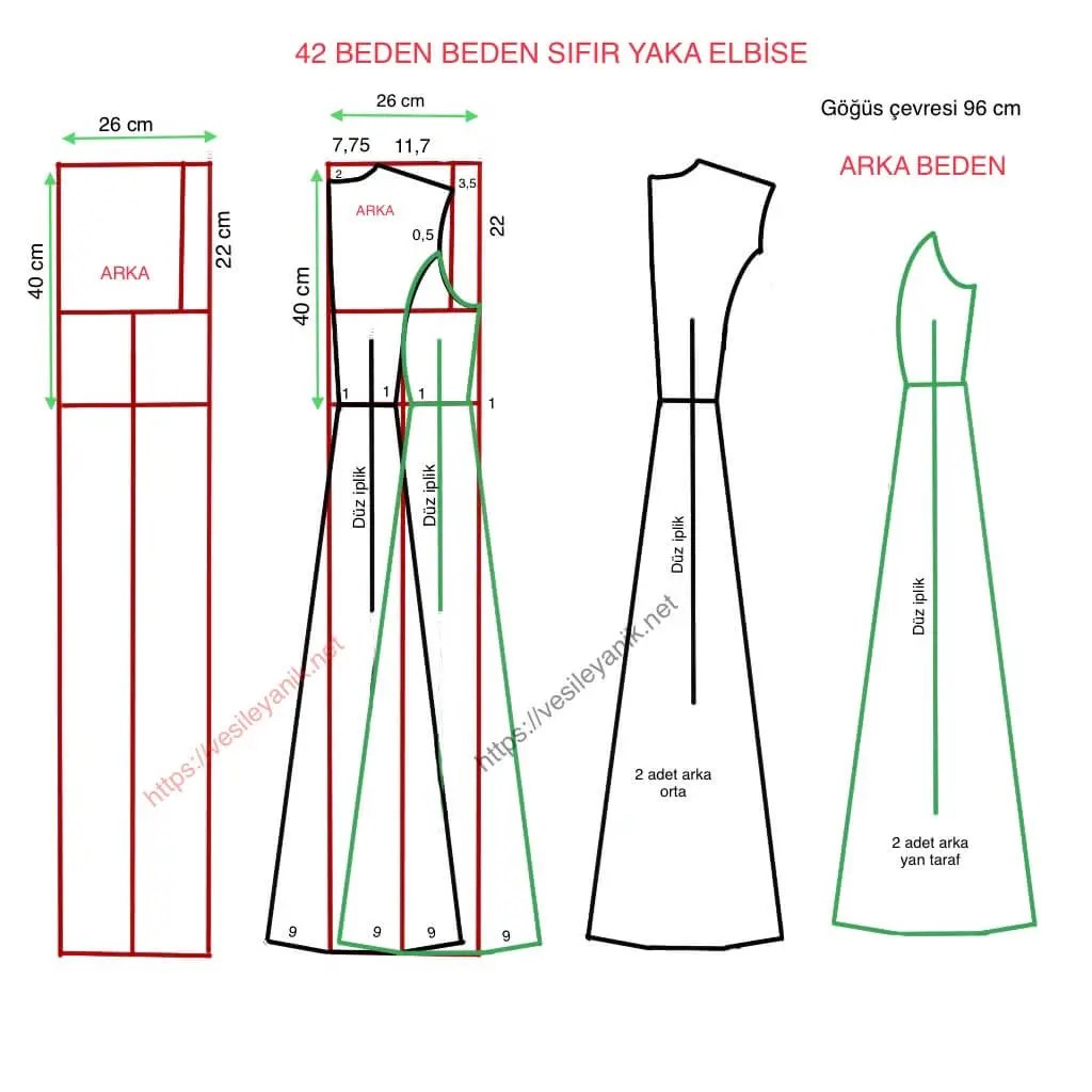 Yukarıda panoda modelini verdiğim elbisenin, ön ve arka kalıbının minyatürünü çizimler üzerinde ayrıntılara girerek anlattım. Her parçayı farklı renkte çizdim. Ölçüleri verdim. Elbise boyu, kol boyu ve bel uzunluklarını kolayca uzatıp kısaltabilirsiniz. Biraz dikiş bilginiz varsa bir bakışta her şeyi anlayabilirsiniz.