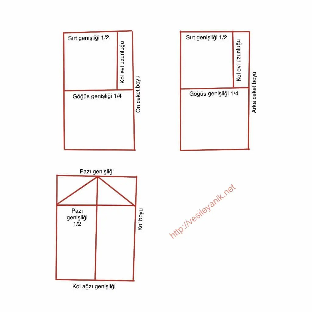 Kol: pazı = 39 cm, kol boyu = 58,5 cm, kol ağzı için bileğimizi ölçüp verilen genişlikle karşılaştırıp kontrol edelim.