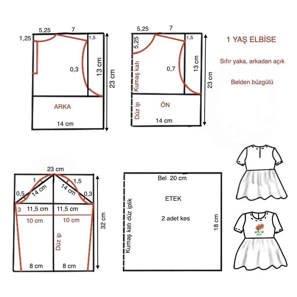 Kalıpların dikiş yerlerine birer cm dikiş payı verelim. Kalıpların düz ipini kumaş kenarına paralel serelim. Kolun tepe noktasına ve ön kısmına birer çıt atalım. Önce omuzları birleştirelim. Yaka için 3 cm eninde verevden biye keselim. İkiye katlayarak yaka çevresine dikelim. Makinada biyeyi içe doğru bastıralım. Kolları ve eteği takalım. Sonra yan dikişleri kapatalım. Etek ve kol baskılarını yapalım. İplerini temizleyip ütüleyelim. Annesinin ellerine sağlık. Minik kızımız güle güle giysin.