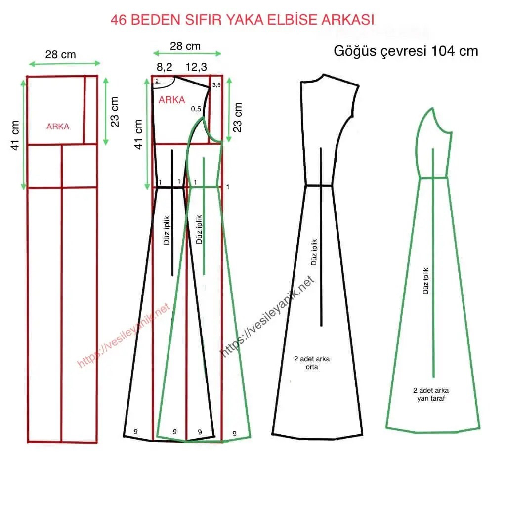 Başlayalım mı? Umarım kâğıt kaleminizi hazırlamışsınızdır. Kalıp çıkarırken bir kaç renk kalem bulundurmanızı tavsiye ediyorum. Böylece parçaları ayrı renklerde çizer ve hangi çizginin hangi parçaya ait olduğunu kolayca görürsünüz. Kopyalarken bu yöntem size kolaylık sağlayacaktır. Göğüs çevrenizin ölçüsünü bolluk vermeden ve sıkmadan normal bir şekilde alın. Bu elbisenin göğüs ölçüsü 104 cm’dir. Sizinki de 104’ten bir eksik veya bir fazla olabilir. Bu sorun olmaz.