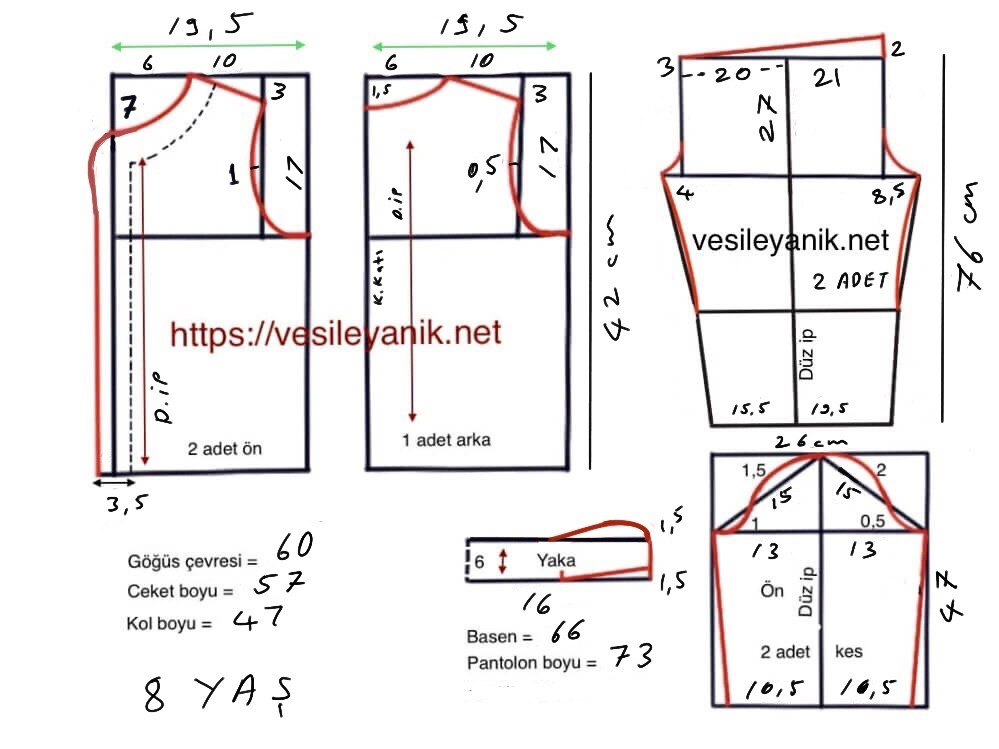 8 Yaş Pijama Takımı Ölçüleri ve Şeması: