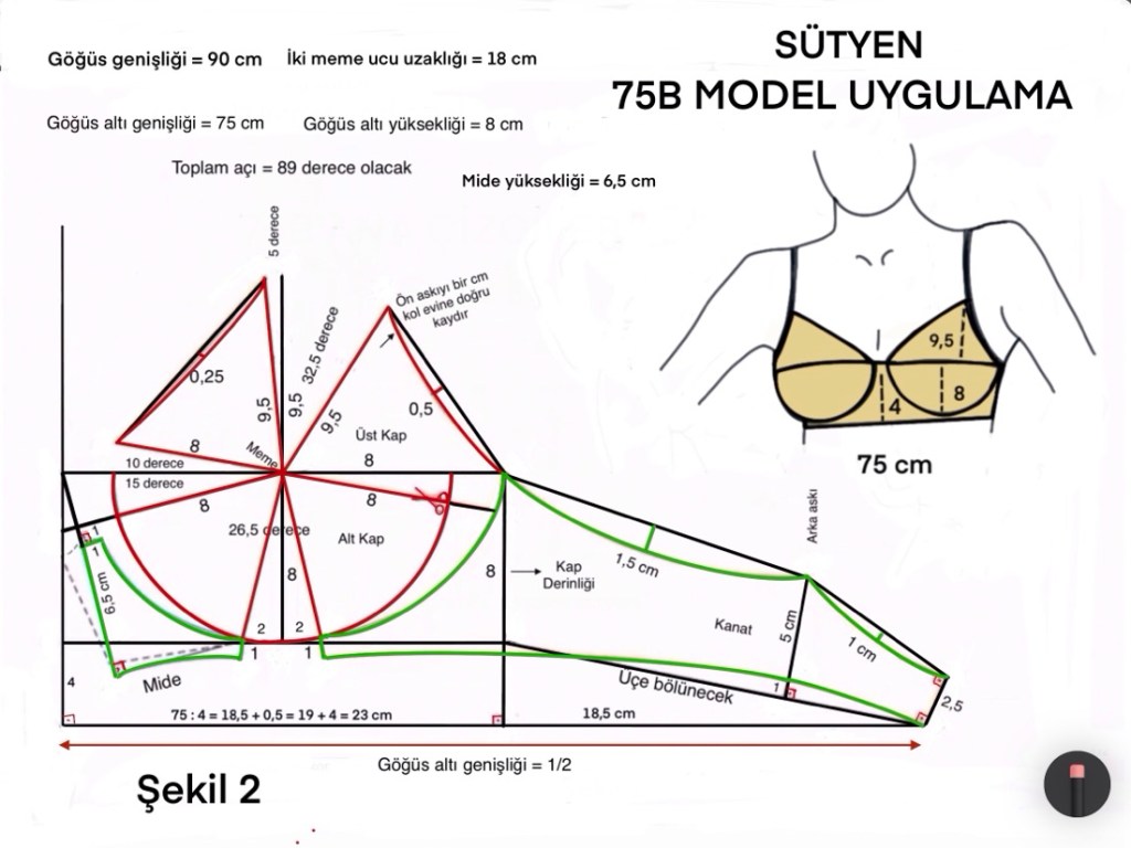 Ölçünüze göre daha önce belirlenmiş bir hazır kalıbı baz alarak, ya da doğrudan kendi ölçülerinize göre çizim yapabilirsiniz. Hazır kalıp kullanıyorsanız, band ve cup ölçünüzle eşleşen beden seçilmelidir.