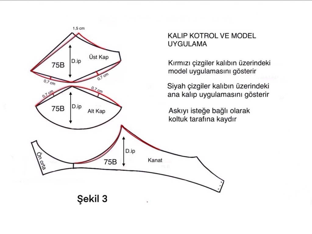 Çizdiğiniz kalıbı ince pamuklu bir kumaşa aktararak bir deneme sütyeni dikin. Vücudunuzda deneyerek, bolluk, sarkma ya da fazla sıkma gibi durumlara göre düzeltmeler yapın.